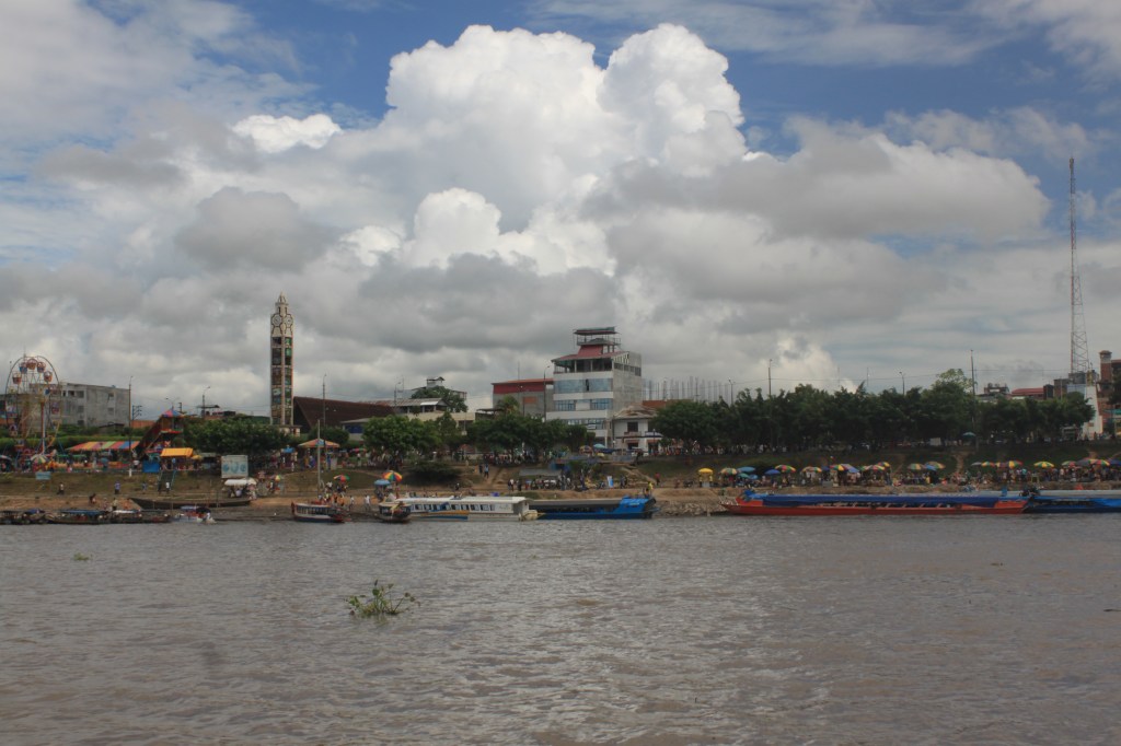 Looking back towards the port from the Ucayali River. La Iglesia Misionera is behind that tall clock tower.
